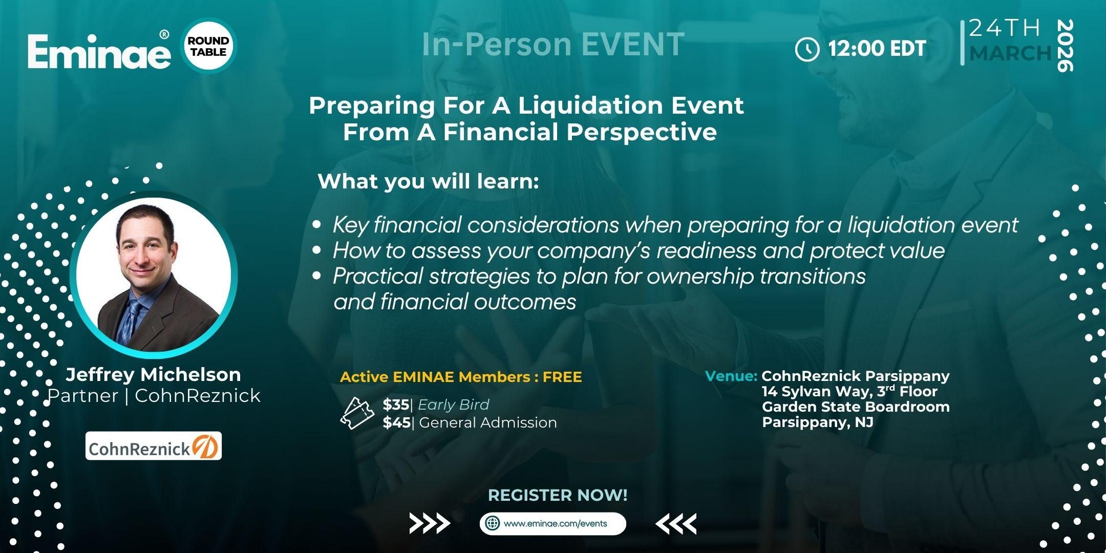 Join us on March 24, 2026, at 12:00 PM at Cohn Reznick, Parsippany Office, 14 Sylvan Way, 3rd Floor – Garden State Boardroom, Parsippany, NJ 07054, for an in-person, practical Lunch & Learn designed for business owners, executives, and financial decision-makers who want to understand the financial implications of a liquidation event and prepare their company for a successful outcome.